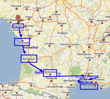 Train jusque Nantes. Il fait la connaissance d'un groupe de bretons. Départ en train vers Marseille par La Rochelle, Rochefort, Bordeaux, Agen, Montauban, Tarascon, Arles, Miramas. Embarquement sur le "Patria" à destination d'Ajaccio. (carte)